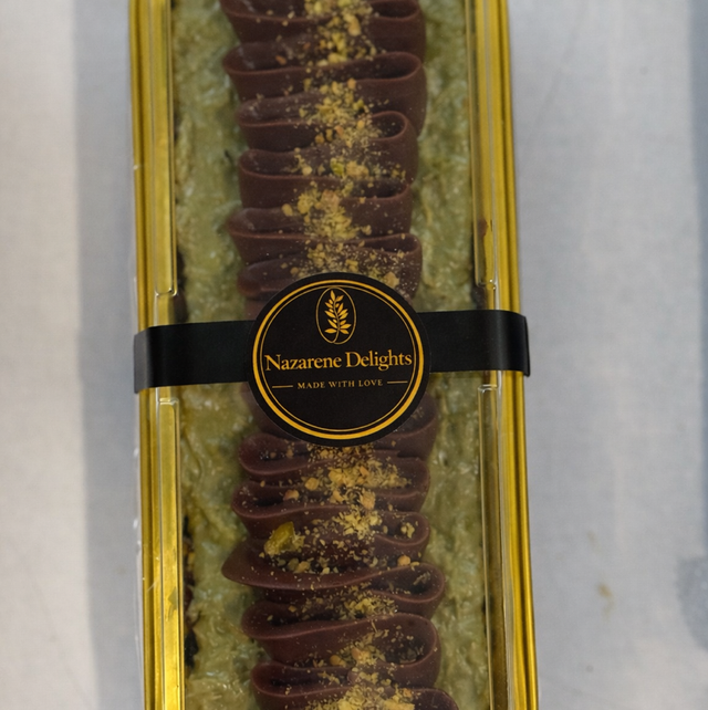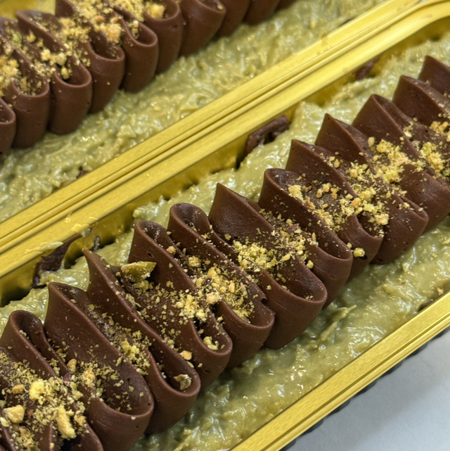 A fudgy chocolate brownie layered with pistachio paste mixed with crunchy toasted kadayifi, topped with silky chocolate and finished with crushed pistachios for a perfect balance of richness and nutty flavour.